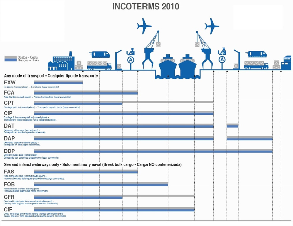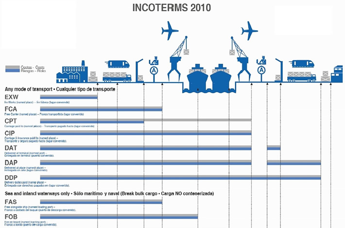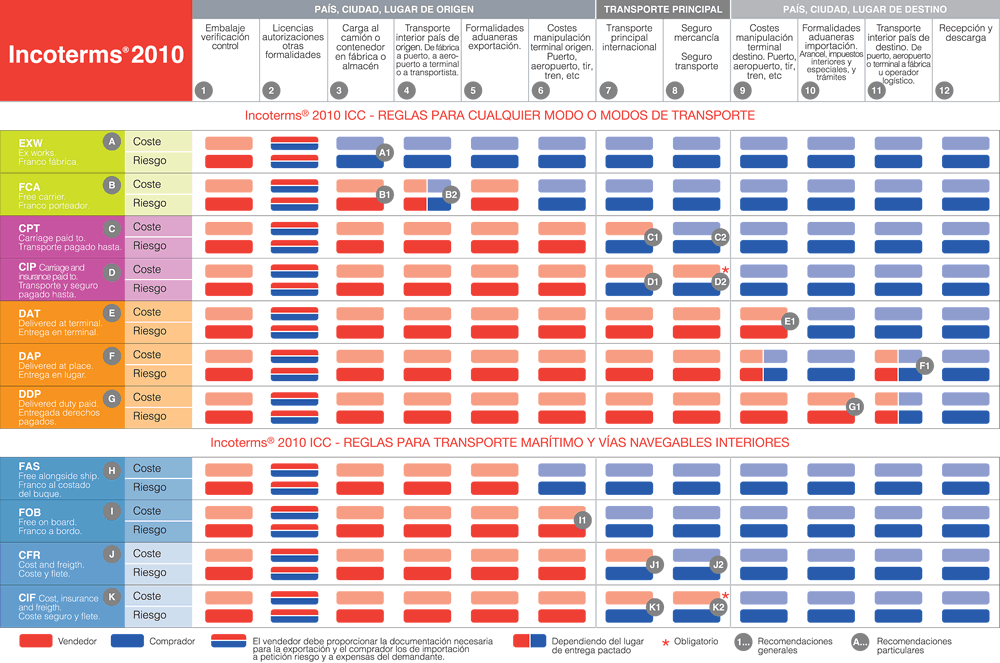 La CCI (Cámara de Comercio Internacional o ICC: International Chamber of Commerce) se ha encargado desde 1936 (con revisiones en 1953, 1980, 1990, 2000 y 2010) de la elaboración y actualización de estos términos, de acuerdo con los cambios que va experimentando el comercio internacional. Actualmente están en vigor los Incoterms 2010 (Desde el 1 de enero de 2011).